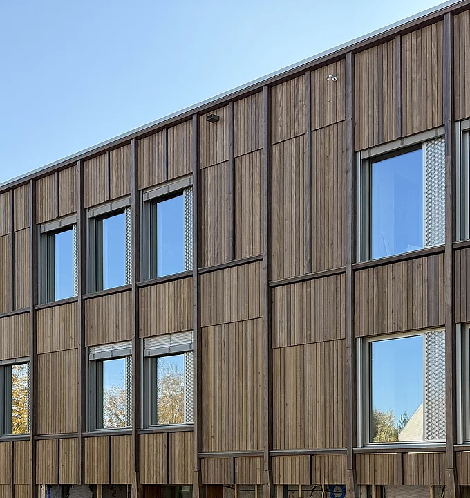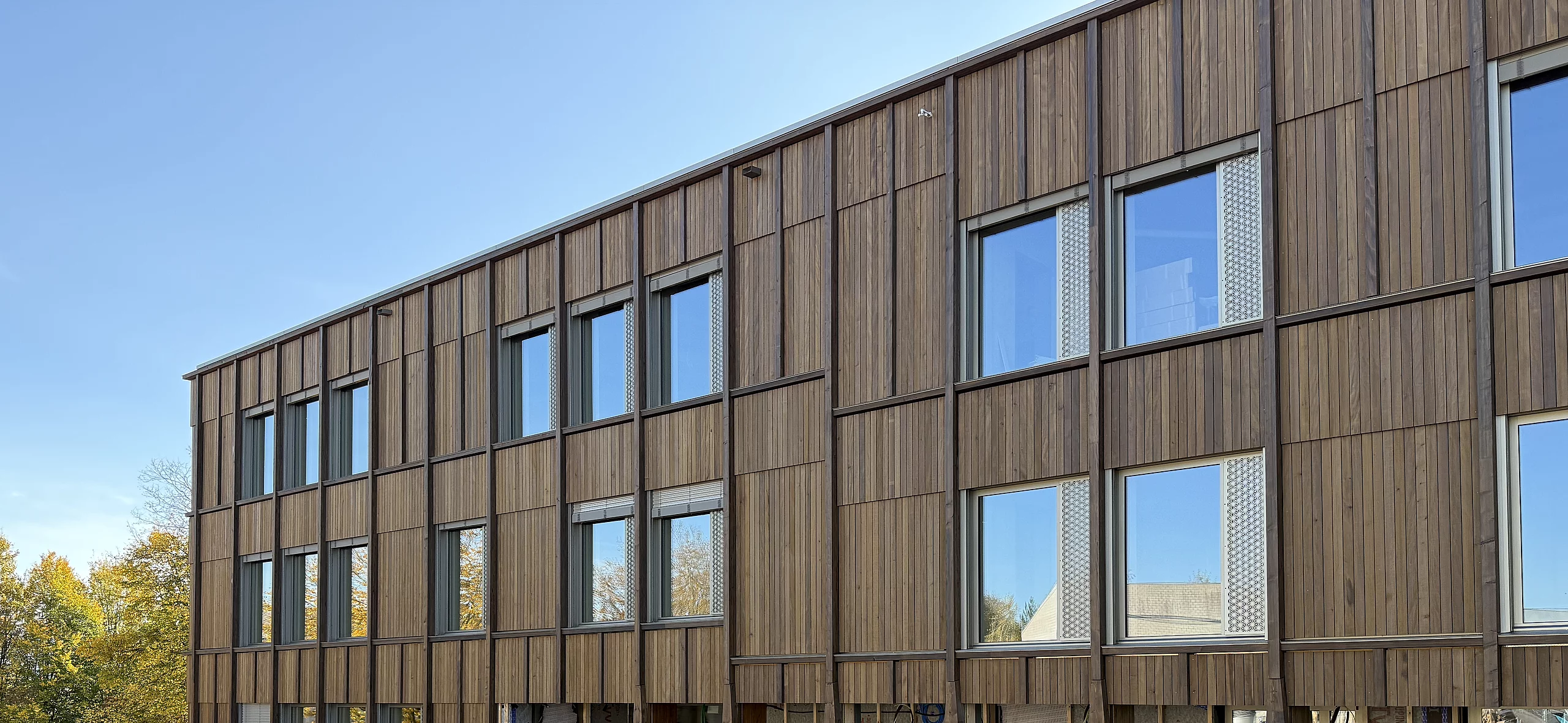 Der sehr hochwertige Holzbau von Naos Architekten aus Bern bietet Platz für 10 Klassenzimmer, teilweise mit separaten Gruppenräumen, einen Kindergarten mit Gruppenraum sowie fünf Spezialräume und diverse Büro- und Lagerräume. Die Gesamtfläche der vorfabrizierten Wilma-Elemente beträgt knapp 2’300 m². Die Elemente wurden mit Recyclingbeton produziert.
