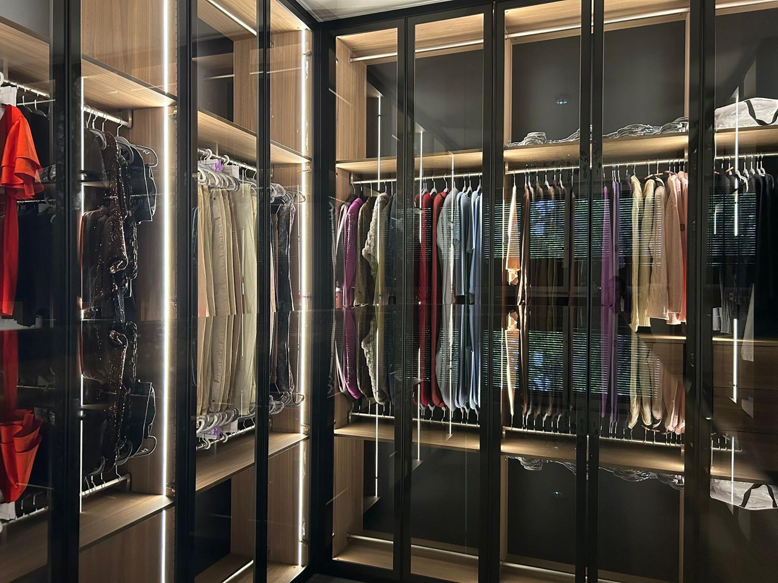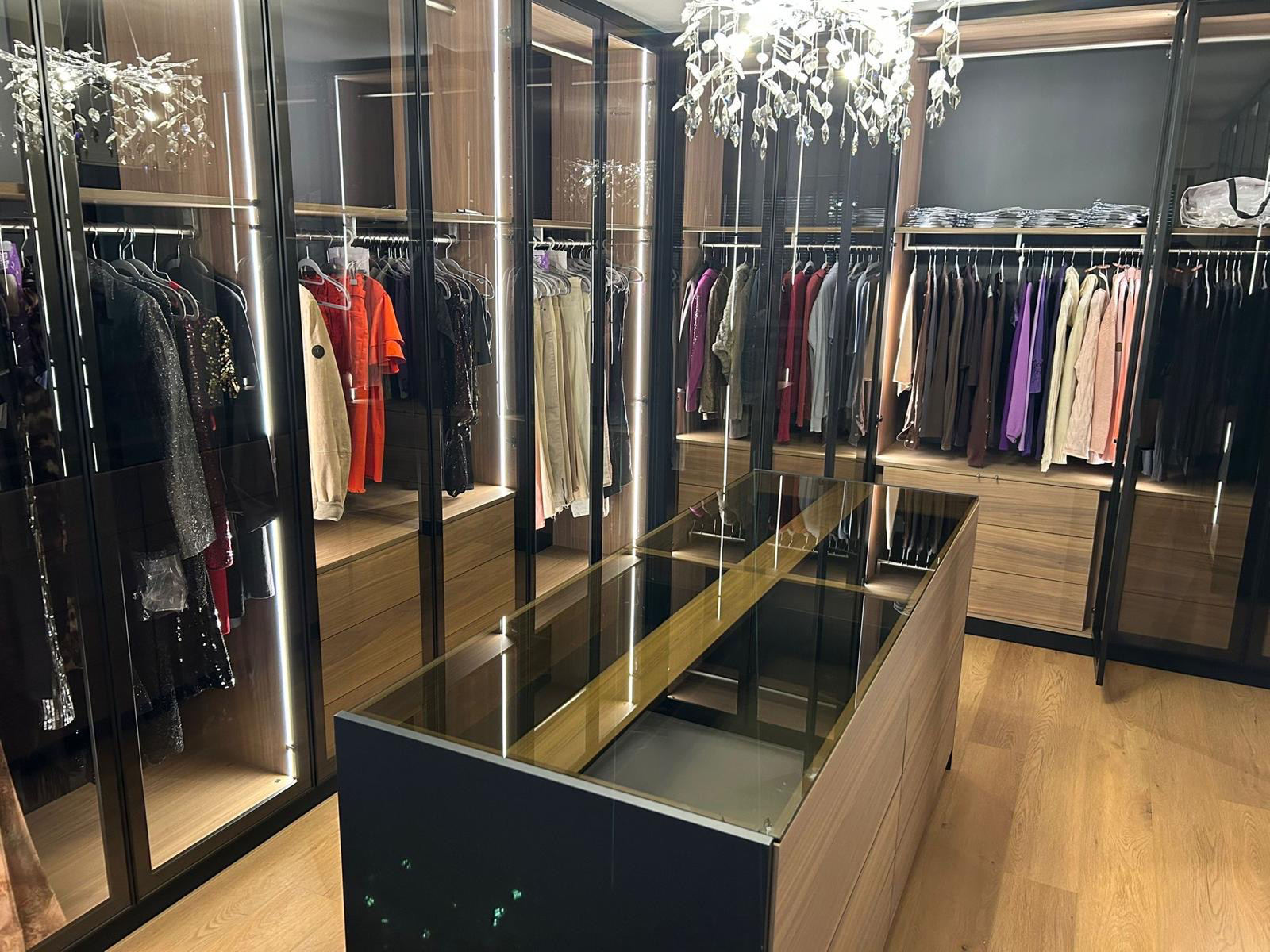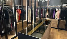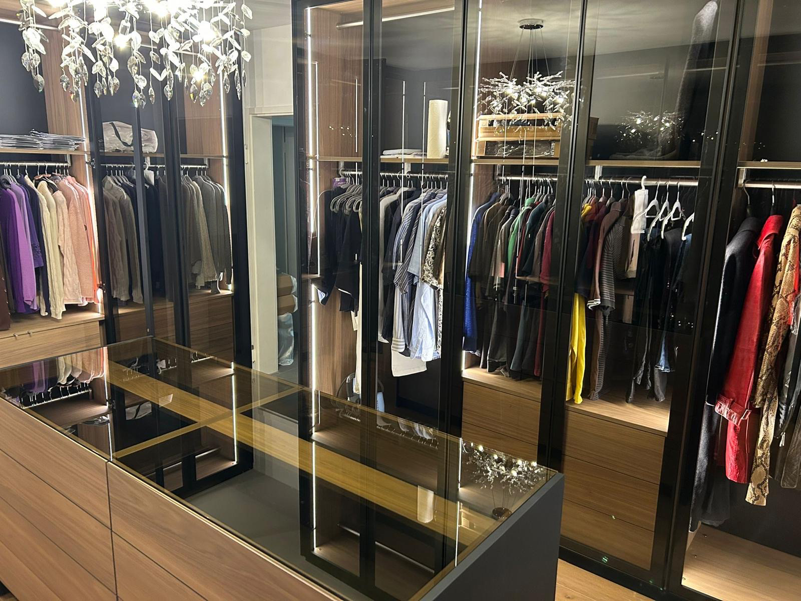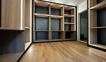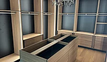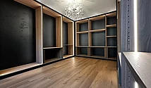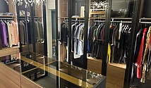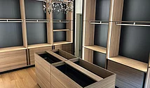 Ce dressing raffiné a été réalisé l'été dernier dans un appartement privé. L'objectif était de créer un dressing haut de gamme à l'atmosphère calme, chaleureuse et confortable.