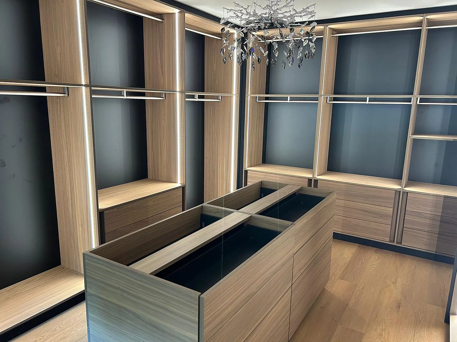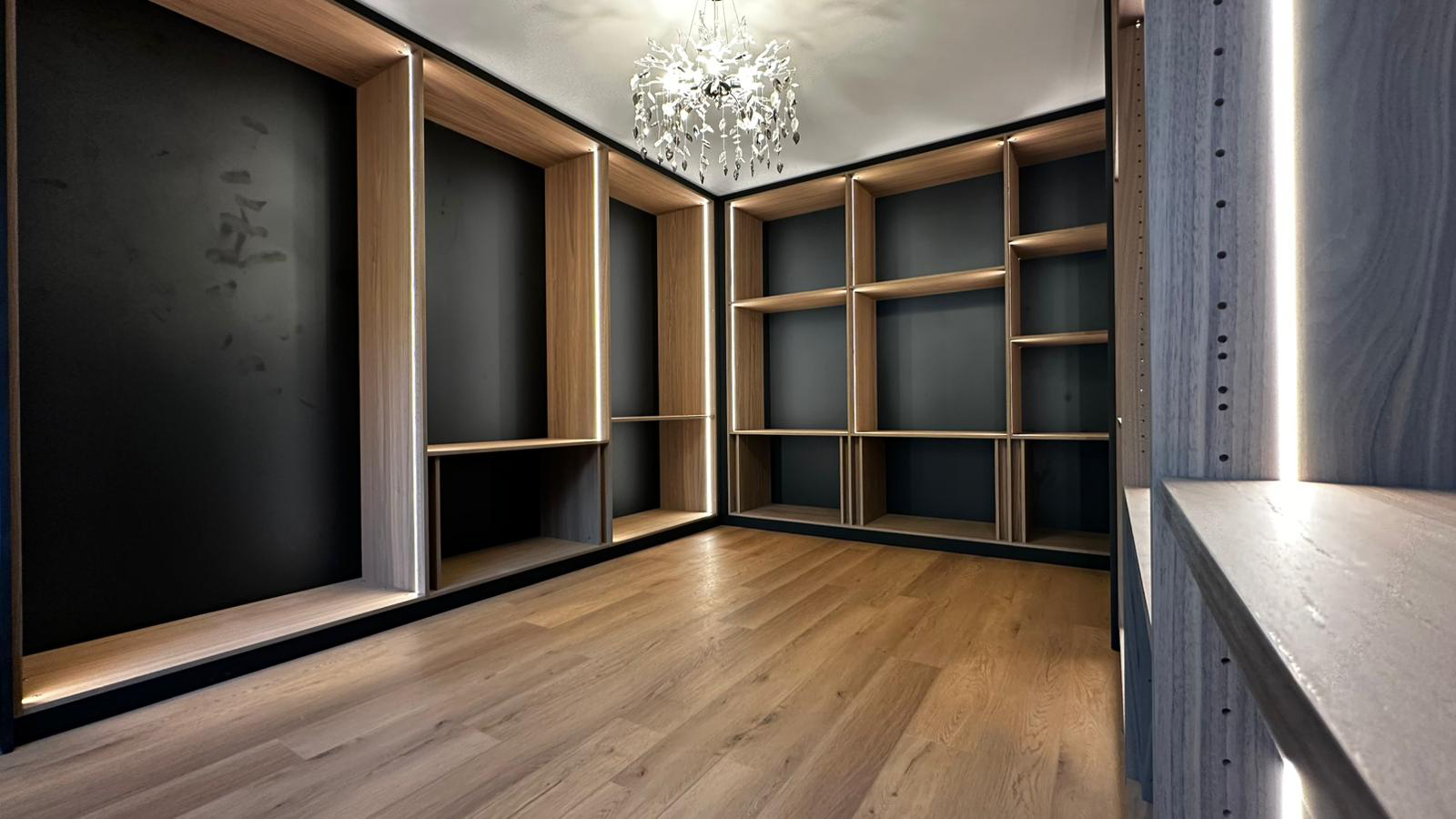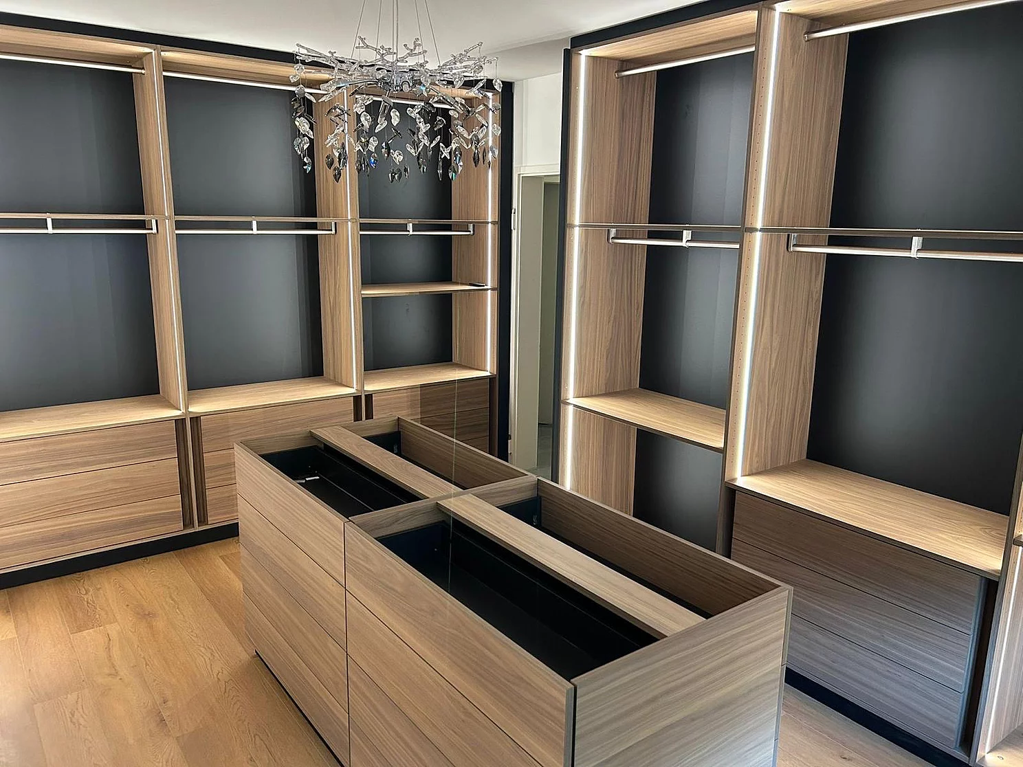 Ce dressing raffiné a été réalisé l'été dernier dans un appartement privé. L'objectif était de créer un dressing haut de gamme à l'atmosphère calme, chaleureuse et confortable.
