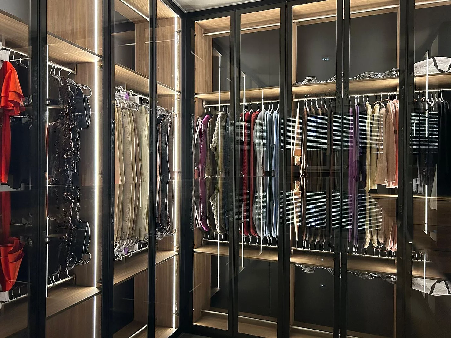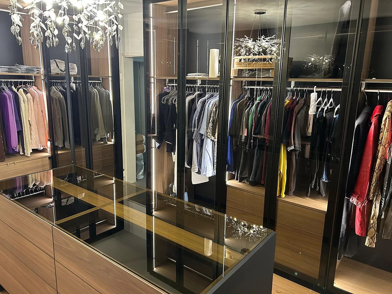 Des portes vitrées protègent les objets à l'intérieur et donnent au dressing un aspect ordonné. Pour obtenir le mix souhaité de style et de fonctionnalité, des panneaux décoratifs de deux fabricants différents ont été retenus.