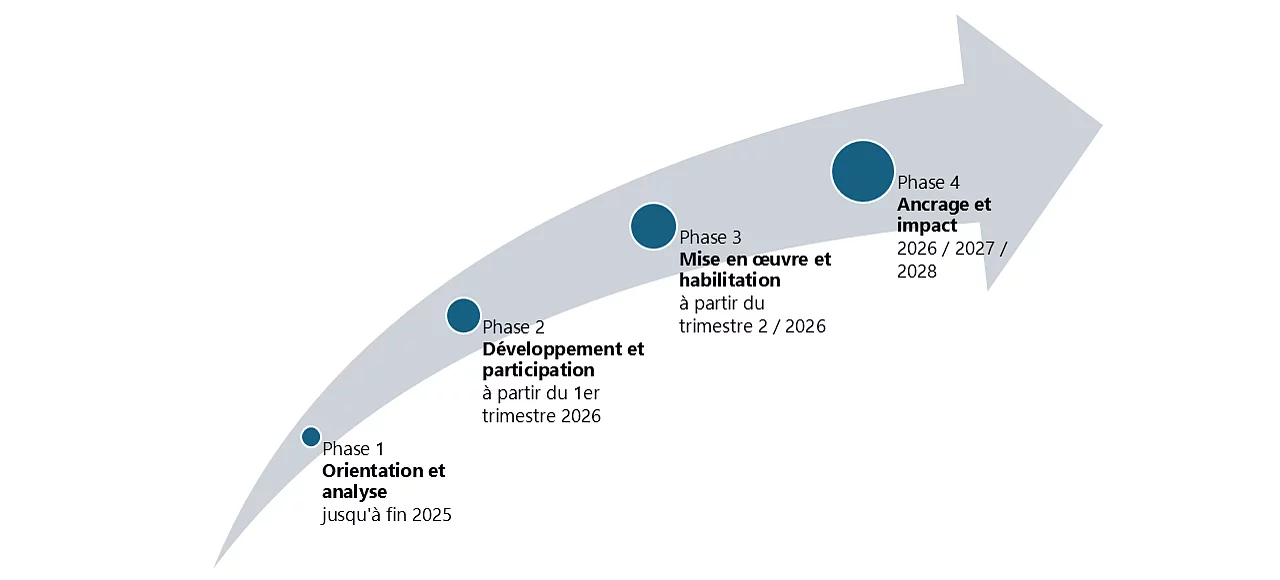 Phase 3 – Mise en œuvre et habilitation (à partir du deuxième trimestre 2026) : Les premières mesures sont mises en œuvre. Grâce à des formations continues ciblées, les cadres et les équipes sont habilités à contribuer activement au succès.