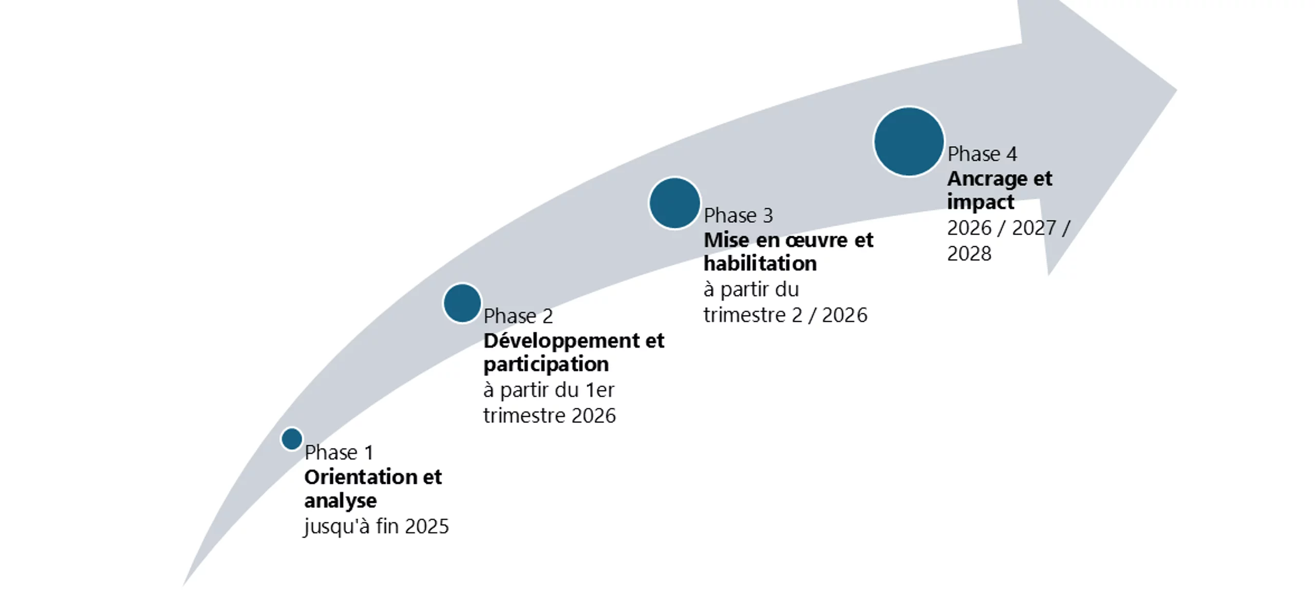 Phase 4 – Ancrage et effet (2026 / 2027 / 2028) : Les succès sont visibles, la stratégie est mise en œuvre au quotidien. Chaque décision, chaque processus et chaque innovation nous rapprochent de notre vision.