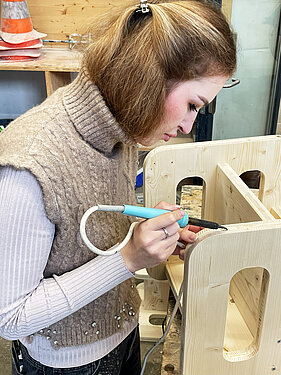 Wie auch schon bei den vorangegangenen Kursen hatte unsere Produktionsgesellschaft die Platten auf Fertigmass hergestellt. Durch diese passgenaue Vorarbeit unseres Bearbeitungs- und Zuschnittzentrum (BUZ) mit CNC Maschinenarbeit sowie dem entsprechenden Zuschnitt brauchten die teilnehmenden Studierenden den Werkstoff im Grunde nur noch zu fertigen Hockern zusammen schrauben. Nachdem die Platten die modernen Grossanlagen des BUZ verlassen hatten, waren lediglich Schleifen, Verputzen und Zusammenbau erforderlich. Anschliessend haben die Teilnehmenden die fertigen Hocker mit Verzierungen und Grussbotschaften versehen.