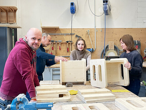 Der Workshop der Hochschule verdankte sich dem erneuten Engagement von Selina Lutz. Die Wissenschaftlerin der Hochschule Luzern erläutert in ihrer Eigenschaft als Projektleiterin des Workshops die Aufgabenstellung: «Die ukrainischen Teilnehmenden sollten Hocker auf Grundlage des Möblierungskonzeptes Motiro (dt.: «gemeinsam Gutes tun») erstellen und mit einer Verzierung eine Grussbotschaft hinterlassen.» Das modulare System Motiro ermöglicht eine variable Nutzung von einzelnen Bestandteilen wie Tischen, Bänken – oder eben Hockern –, fördert eine ungestörte Lernatmosphäre für Kinder und ermöglicht freies Spielen. Hinzu kam ein Workshop zum Thema Kleinwohnformen. Dabei entwickelten die Teilnehmenden im kleinen Massstab Visionen für mögliche Wohnformen in der Ukraine.
