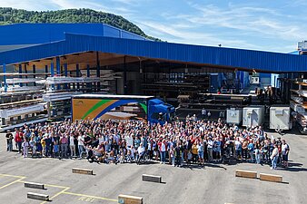 Am Freitag, 5. September 2025, kamen rund 500 Gäste aus Politik, Geschäftswelt und Verbänden beim feierlichen Kundenevent zusammen. Nach Netzwerk-Apéro und Betriebsbesichtigung mit einer Bimmbelbahn folgte die Begrüssung durch CEO Roger Kuratle. In seiner Ansprache betonte er: «Holz ist kein kurzfristiger Trend, sondern ein langfristiger Fokus.» Mit diesem Leitgedanken blickte er auf aktuelle Projekte, innovative Lösungen und die Bedeutung der fortlaufenden Entwicklung.