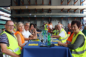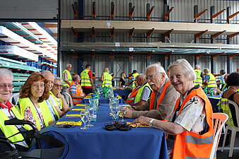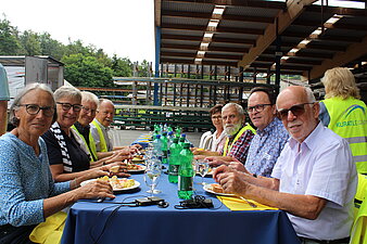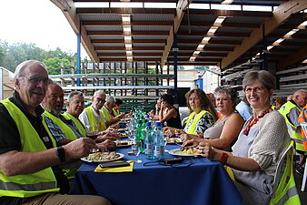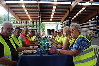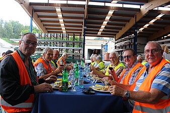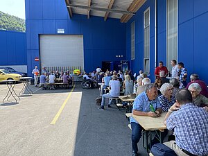 Gegen 11.45 Uhr war es Zeit für eine Stärkung. Das Essen wurde draussen serviert, an dem Ort, an dem normalerweise die LKWs ihre Waren auf- und abladen. Aufgetischt wurden verschiedene Salate, Kartoffeln, Grillgerichte und Desserts. Im gemütlichen Rahmen tauschten sich die Gäste während des Mittagessens über die alten Zeiten und die Geschehnisse der vergangenen Jahre aus.