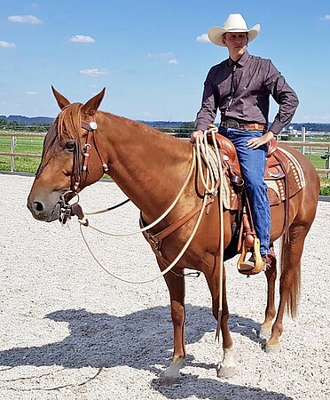Mein Herz schlägt gleichermassen für beide Sportarten. Seit über dreissig Jahren, und somit seit meiner Kindheit, bin ich im Eishockey aktiv. Dies beinhaltet wöchentliche Trainings und Matchs. Aktuell spiele ich in der 4. Liga beim HC Bätterkinden-Koppigen und hüte das Goal. Frei nach dem Motto «Go Hard or Go Home». Zum Reitsport fand ich durch meine Ex-Frau. Sie ist leidenschaftliche Dressurreiterin. Zu Beginn habe ich sie öfters begleitet und irgendwann entschloss ich mich dazu, mich selbst aufs Pferd zu setzen. Ich wollte erfahren, wie sich das anfühlt. Von Anfang an sagte ich ihr aber, dass ich nur als Cowboy reiten werde! Deshalb habe ich mich im Westernreiten weiterentwickelt. Später habe ich das ältere Pferd meiner Ex-Frau übernommen. Übrigens kann man grundsätzlich mit jedem Pferd jeden Reitstil ausüben. Als ich mein erstes eigenes Pferd einschläfern musste, habe ich mir vor neun Jahren ein junges Quarter Horse zugelegt. Dabei handelt es sich um ein typisches Westernpferd. Sein Ursprung liegt in Amerika, von woher sein Vater stammt. Mein «Mr Smart Corason» ist in der Schweiz geboren. Gelegentlich nehme ich mit ihm an Cow-Horse-Days teil. Bei diesen Tournieren geht es tatsächlich um Kühe. Ein Team von drei Reitern haben die Aufgabe, zwei bis drei Kühe von einer Herde aus zu sortieren und gemeinsam durch einen Hindernisparcours zu treiben oder mit dem Lasso einzufangen.