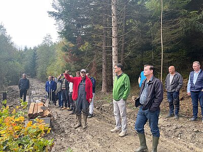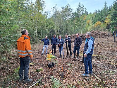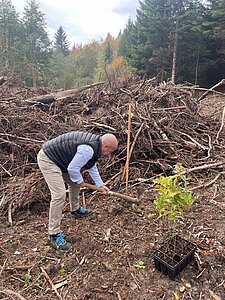 Die Auswirkungen, die der Borkenkäfer anrichtet, waren auch bei dieser Baumaktion zu sehen, diesmal allerdings in einem Waldstück, das hauptsächlich aus alter, abgeschwächter Fichte bestand. Die betroffenen Bäume wurden gefällt, die Parzelle gesäubert und vorbereitet. Die Rückwege wurden angelegt und die Verteilung der Setzlinge von Jean-Philippe und seinem Team festgelegt.