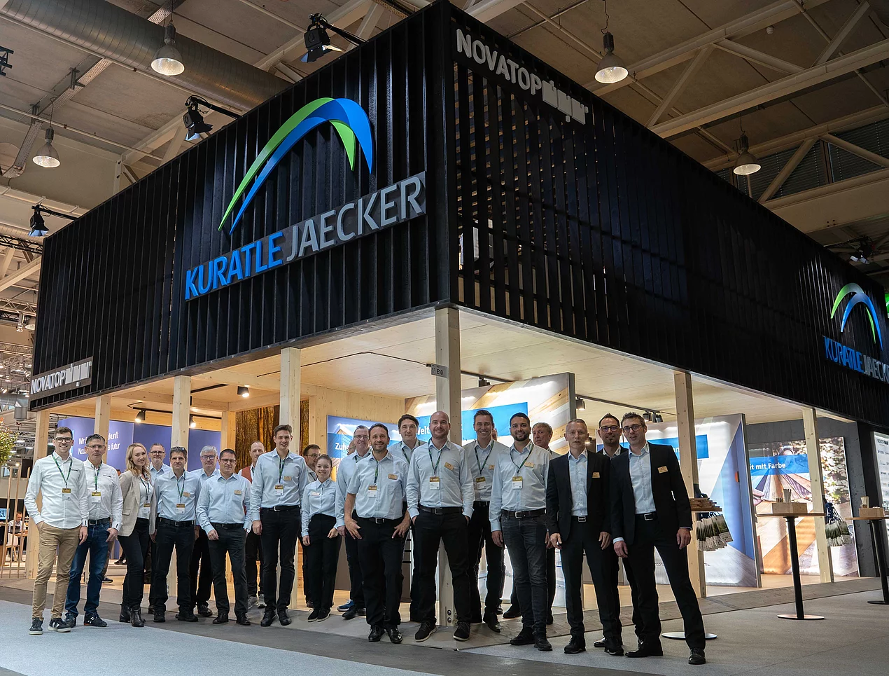 Der einzige zweistöckige Stand an der wichtigsten Messe des Jahres kam sehr gut bei den Besuchenden an. Dass er komplett aus Holz gebaut wurde – und zwar aus dem Holz unseres Partners Novatop (und an der Front mit schwarzem, karbonisiertem Holz) – fand bei vielen Gästen lobende Erwähnung. Die obere Etage mit Gastronomie lud zum Netzwerken ein. Bemerkenswert: Es war die höchste Gastronomie an der ganzen Messe.