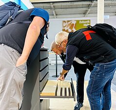 Auch für Raphael ein Highlight: der Akustikraum. «Hier liess sich eins zu eins erleben, wie angenehm es ist, sich in einem Raum mit Akustikplatten zu unterhalten», sagt Raphael. «An der Messe war es sehr laut. Das führte zu einer gewissen Belastung. Das sinnliche Erlebnis, was Raumakustik bewirken kann, war einfach genial.»