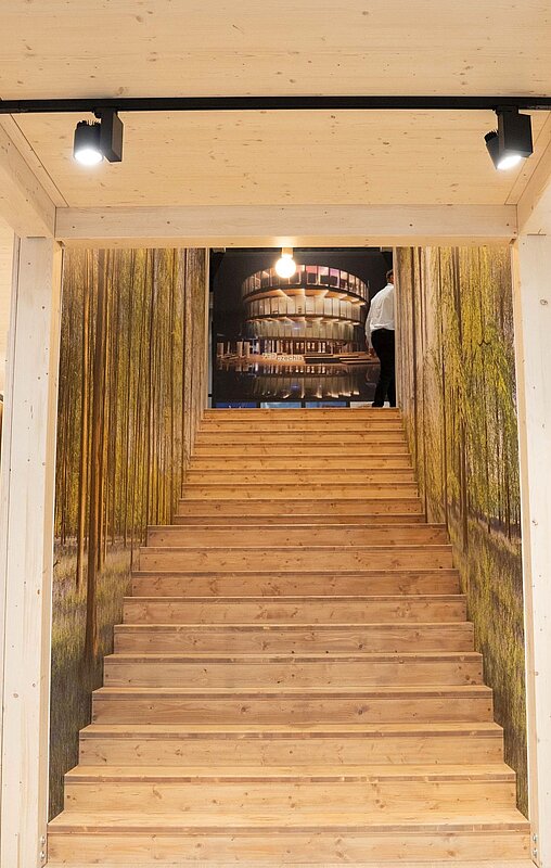 Das zweite wichtige Element war die Treppe. Mittig platziert sorgte auch sie für die richtige Statik. Zugleich repräsentierte sie das Motto «Vom Wald zur Welt». An der Seite waren Waldbilder zu sehen. Die Stufen führten nach oben zu einer Abbildung von der Weltaufstellung, an der Novatop einen Stand gebaut hatte. Die Möglichkeiten, die für den Stand zur Verfügung standen, wurden voll ausgereizt. «Grösser hätte man den Stand nicht bauen können», sagt Radek Oslizlo, technischer Direktor von Novatop.