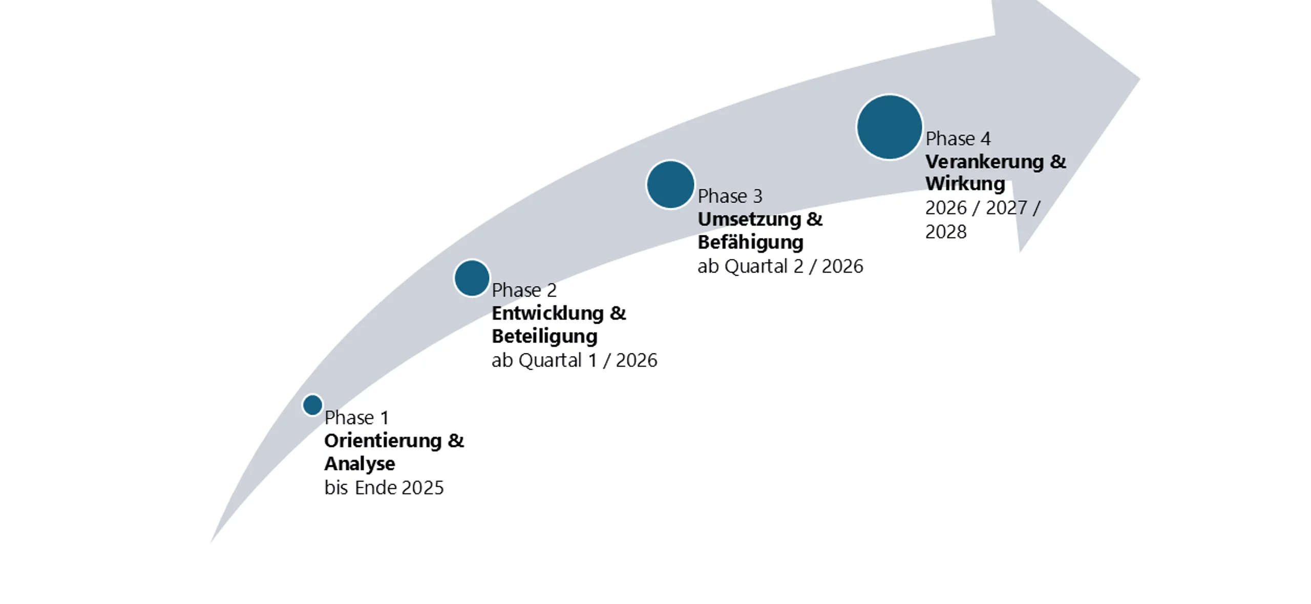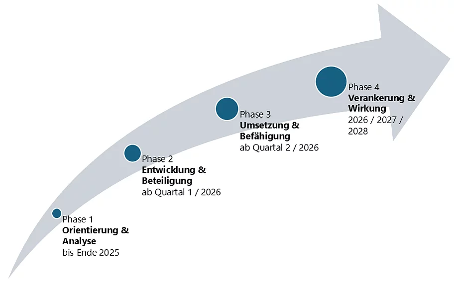 Phase 4 – Verankerung & Wirkung (2026 / 2027 / 2028): Erfolge werden sichtbar, die Strategie wird im Alltag gelebt. Jede Entscheidung, jeder Prozess und jede Innovation bringen uns unserer Vision näher.