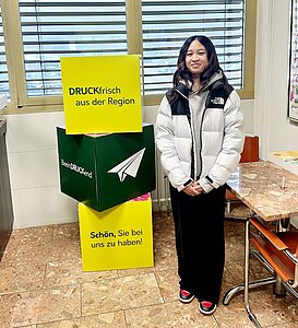 «Als Polygrafin ist es wichtig zu wissen, wie Druckmaschinen funktionieren, welches Druckverfahren sich am besten für ein bestimmtes Produkt eignet und wie man Druckdaten richtig aufbereitet», erklärt Maxie. Da die meisten Polygraf:innen in einer Druckerei arbeiten, gehört dieses Wissen für viele zum Berufsalltag. Umgekehrt fielen Maxie Druckthemen in der Schule manchmal schwer, da sie ihren Arbeitsplatz im Büro hat. «Umso hilfreicher war jetzt dieser Besuch für mich.»