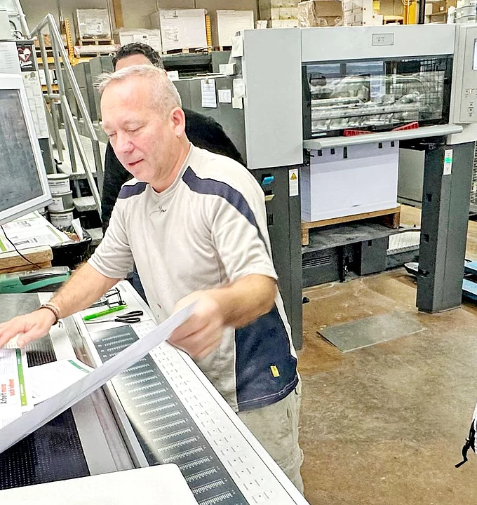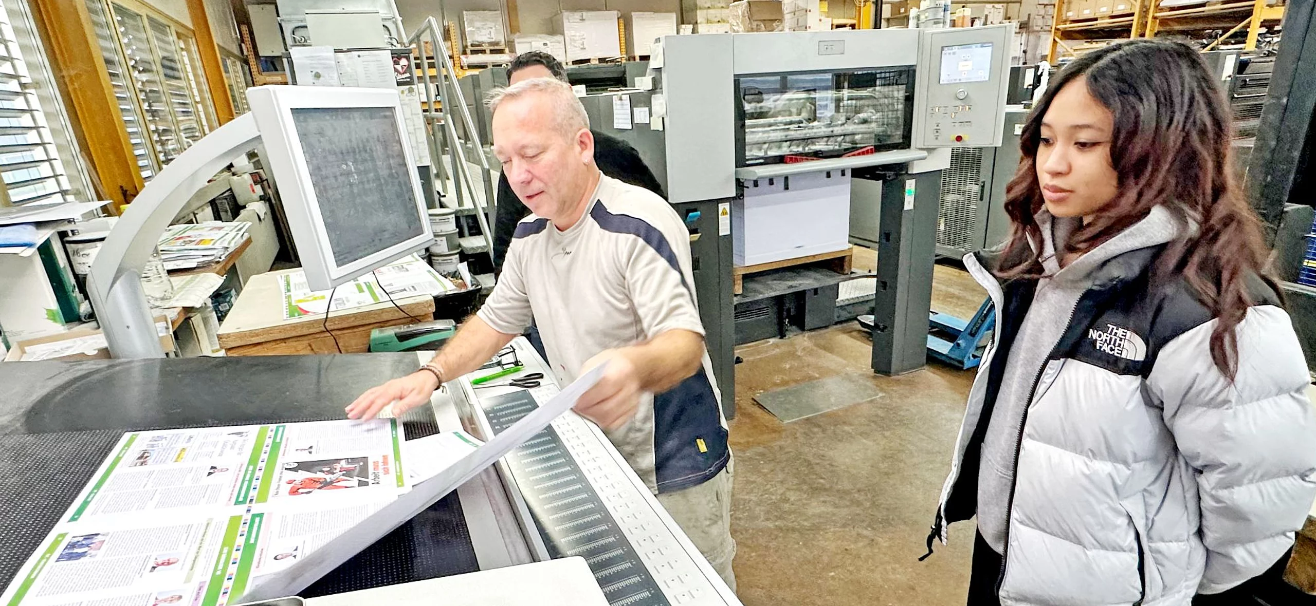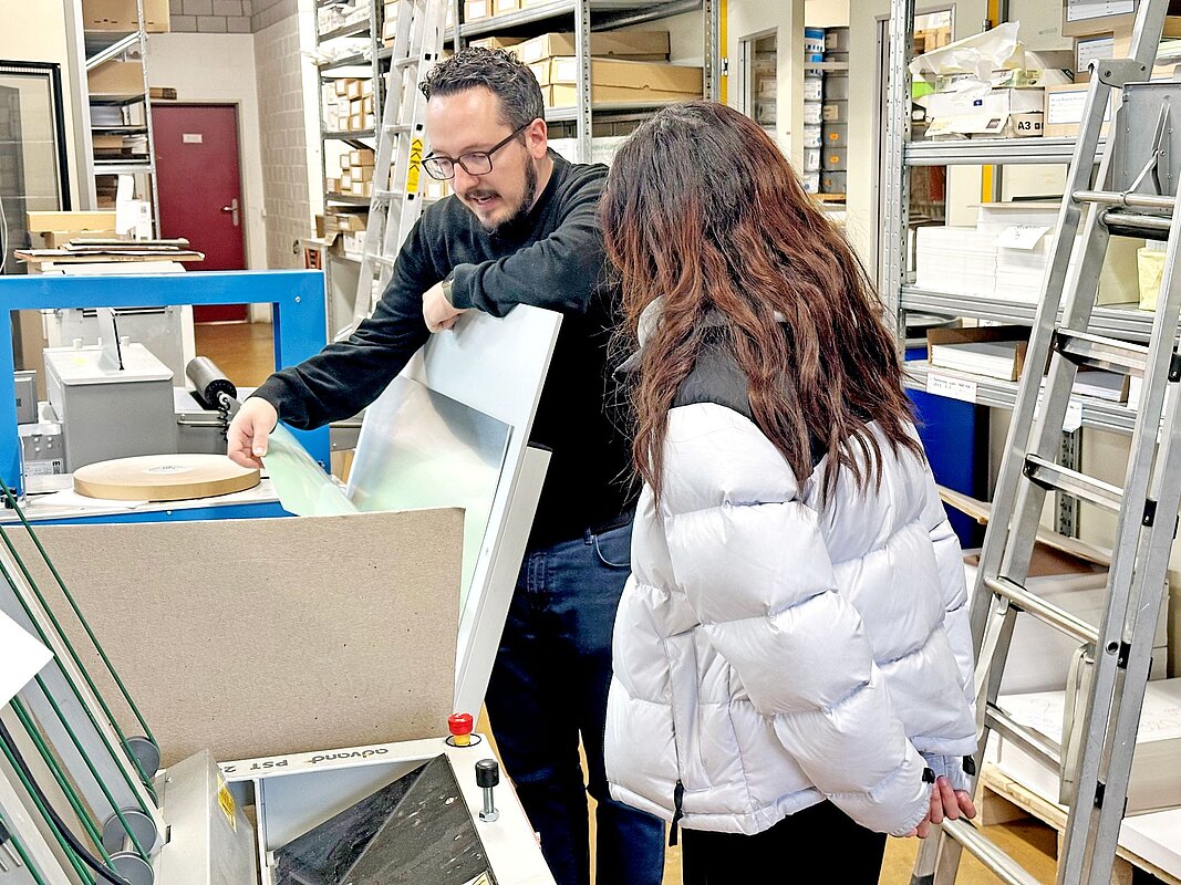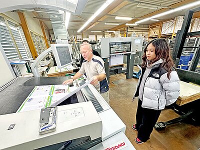...hat viel zu entdecken: Mitte Dezember 2025 besuchte Max Alegra «Maxie» Carlos mit ihrem Berufsbildner Marek Cizmar, Polygraf im Marketing von Kuratle & Jaecker, die Druckerei Weibel Druck AG in Windisch.